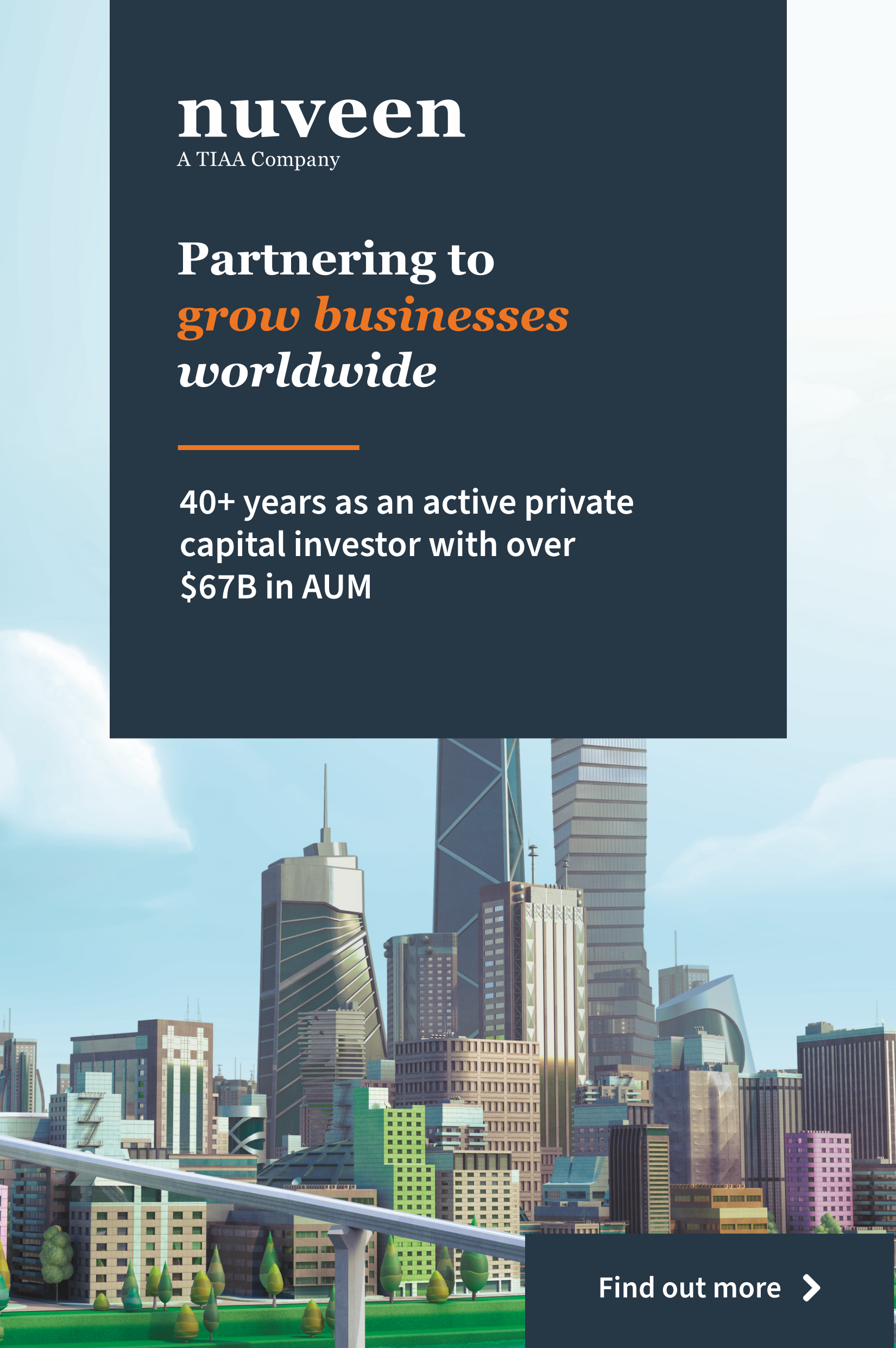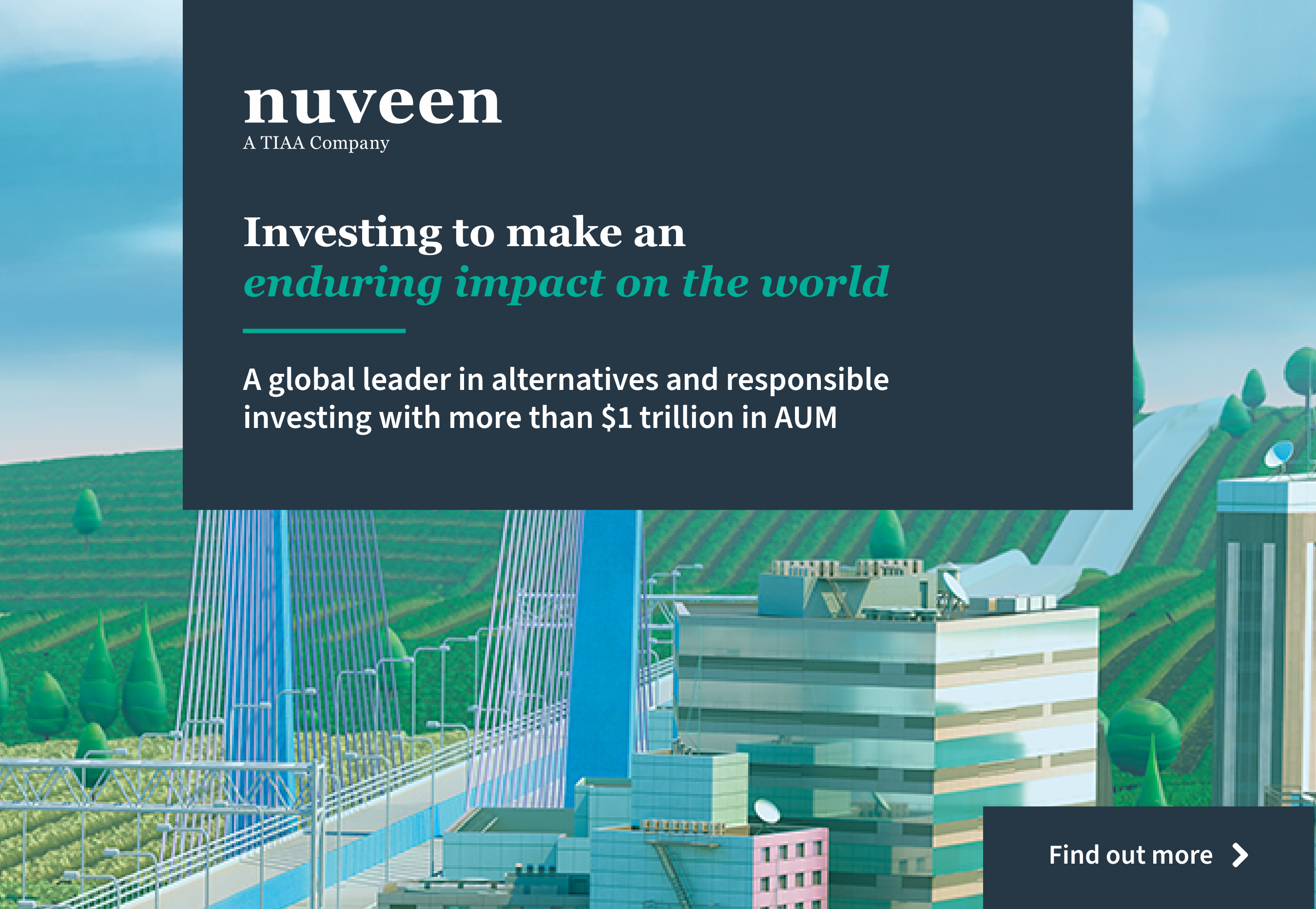 Nuveen, società d’investimenti di TIAA – una delle maggiori istituzioni finanziarie statunitensi – offre un’ampia gamma di soluzioni d’investimento finalizzate a raggiungere gli obiettivi finanziari di lungo termine di investitori istituzionali e privati. Con 1,2 trilioni di dollari di patrimonio in gestione (al 30 giugno 2021), Nuveen è presente in 27 Paesi.